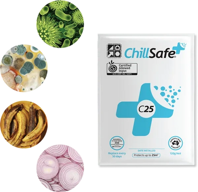 ChillSafe is a simple, low-maintenance sachet placed inside cool rooms and refrigerated spaces. Using the airflow from existing fans, it gradually releases a food-safe hydrogen peroxide vapour that circulates throughout the room. The ultra-low-dose vapour activates 24/7 to target and eliminate mould, bacteria, yeast, and odours in both air and on surfaces. ChillSafe creates a cleaner, safer, and more efficient refrigeration space - all without requiring power, maintenance, personal protection or downtime.